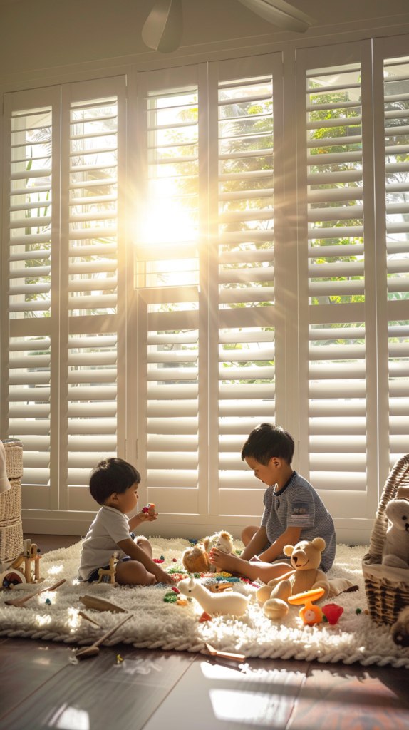 A good night’s sleep is crucial for growing children, and plantation shutters allow you to control the amount of light entering the room. Whether it’s nap time or bedtime, you can easily adjust the slats to create a darker, more restful environment. During the day, you can let in natural light while keeping the room cool and comfortable, helping your little one play and rest without harsh glare or overheating.