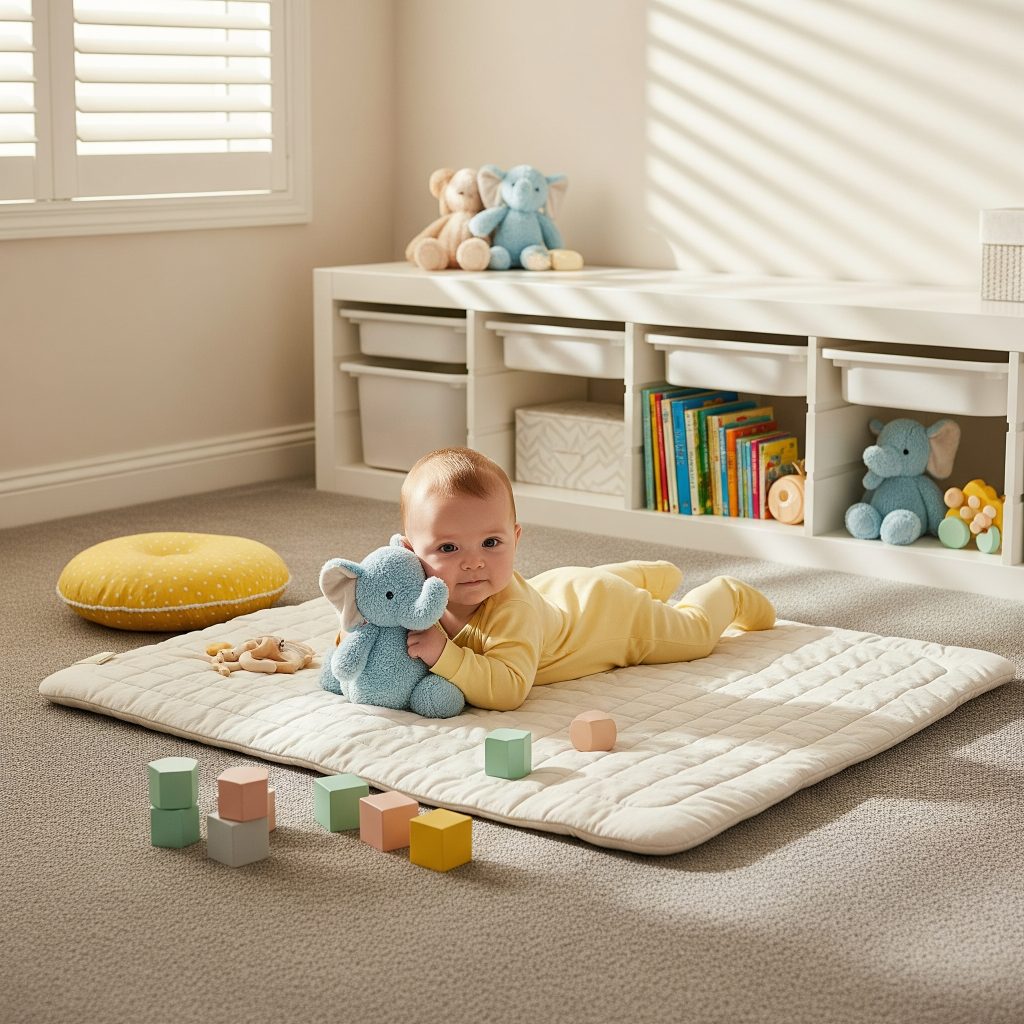 Your little one will be crawling, rolling, and exploring. Soft mats, area rugs, or foam play tiles offer a comfy and safer surface for playtime.